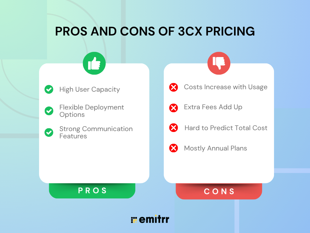 3CX offers a range of plans with flexible options, but the overall value depends on what your business needs and how fast you plan to grow. Below is a quick look at the pros and cons of 3CX pricing plans.