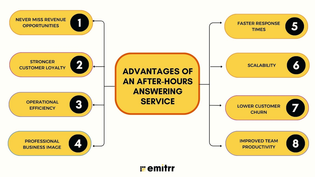 Every call is a chance to win a customer or lose one. An after-hours answering service allows your business to handle calls during late evenings, weekends, and holidays. From being available 24/7 to providing prompt emergency support, the right solution helps you capture leads, build loyalty, and protect your reputation. With Emitrr, you never have to worry about missed calls again. To know more, schedule a free demo with Emitrr AI today!