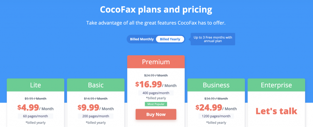 CocoFax pricing plans are divided into five tiers: