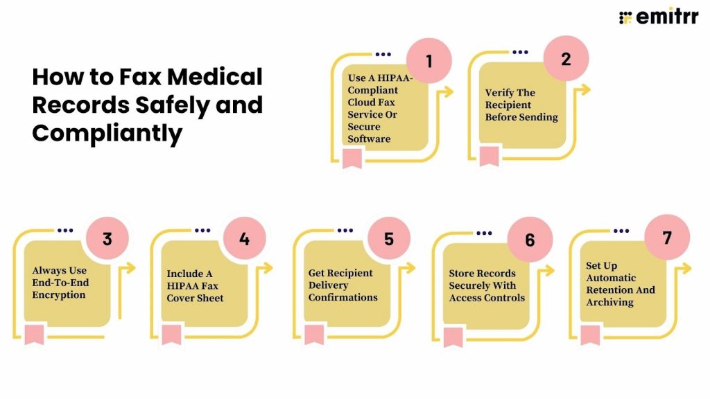 Use a HIPAA-compliant fax service, include a cover sheet, verify the recipient, encrypt the fax, and keep an audit log. This ensures the records stay safe.