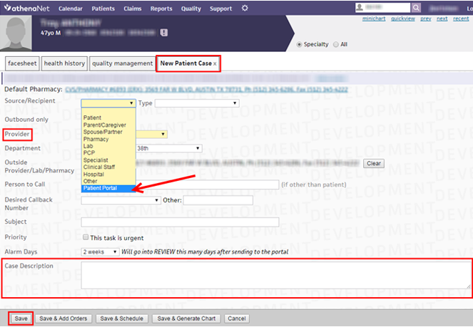In the patient case screen, use the Source/Recipient dropdown and choose ‘Patient Portal’ as the delivery method. If the portal option is not visible, check that the patient has an active portal account.