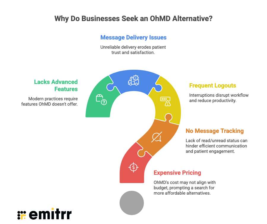 Most practices do not plan on switching tools from day one. The search for an OhMD alternative usually starts when everyday communication begins to feel harder than it should. What looks like a simple texting solution on the surface can turn into higher costs, manual work, and missing capabilities as patient communication grows. Over time, these gaps impact staff efficiency, patient response times, and overall patient experience, pushing practices to look for something more complete.