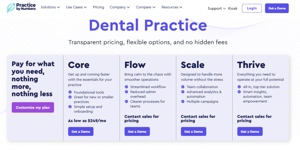 Practice by Numbers (PbN) follows a modular pricing model built mainly for dental practices. Instead of offering one flat bundle, it gives you four tiers, Core, Flow, Scale, and Thrive, and lets you add extra modules like Voice or Payments as needed.