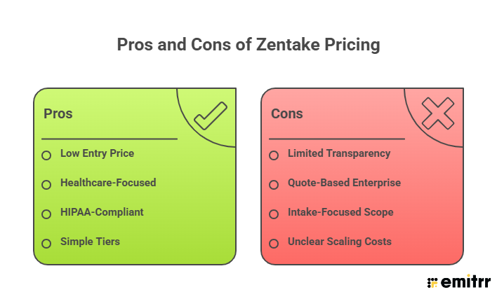 Zentake offers a low starting monthly price ($49/month) , but a limited public breakdown of features at each tier. However, if you are using multiple platforms for different things and would rather have a single platform that combines patient intake forms, patient texting, VoIP phone system, appointment scheduling, AI agent, reputation managment and more, then maybe switching to a platform like Emitrr would be better for you. Before we look at Emitrr’s pricing, let us take a look at the pros and cons of Zentake.